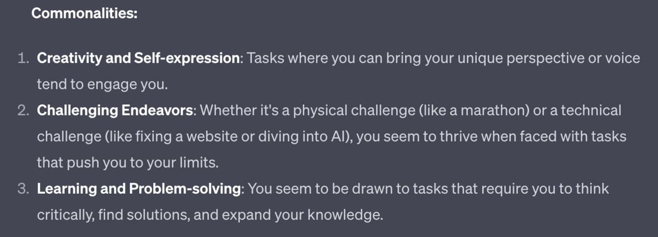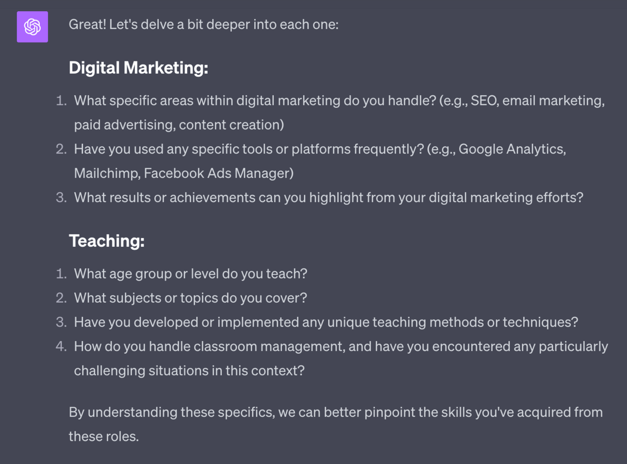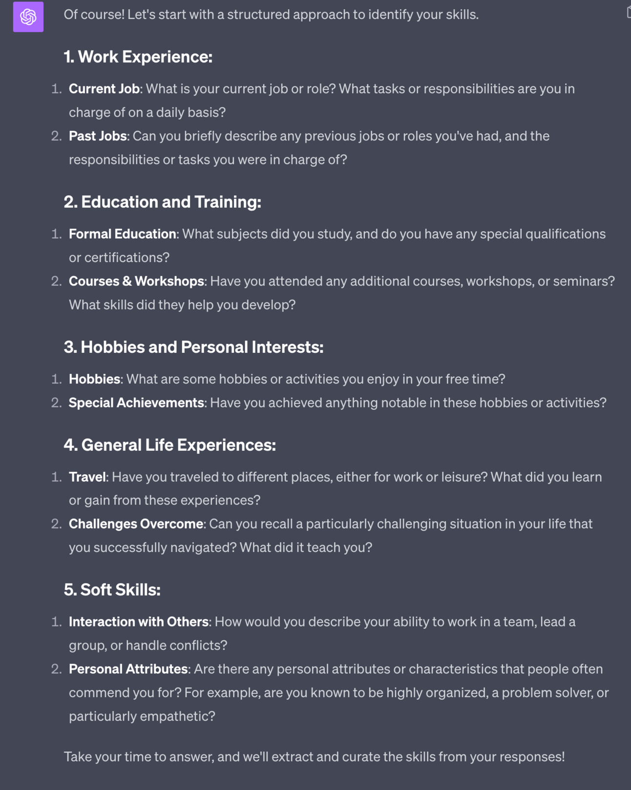 That’ll cause ChatGPT to record these are skills that I have and then it’ll go back to the beginning for me to explore other areas.