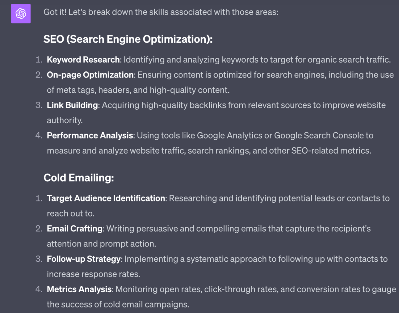 Here I respond “Digital Marketing 1 SEO, cold emailing” for the example. I get this response: