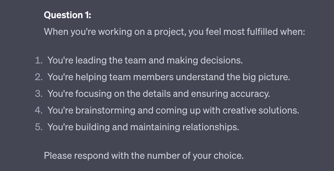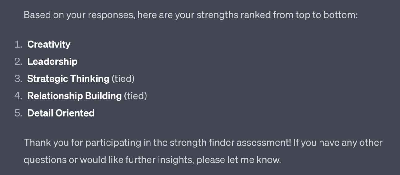 Want this to be even more detailed? Adjust the number of questions asked in the prompt. Doing so allows ChatGPT to assess more strengths. At 30 questions it assesses 5 strengths. At 100 questions it assesses 10 strengths.