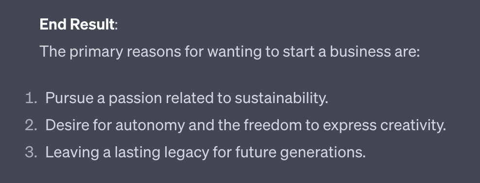 After running through the process ChatGPT will give you your top three reasons for wanting to start a business. These may surprise you.