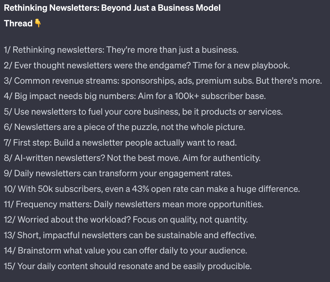 It takes one newsletter issue and chunks into pieces for a thread. Click through to see the full thread as it’s hard to preview here.