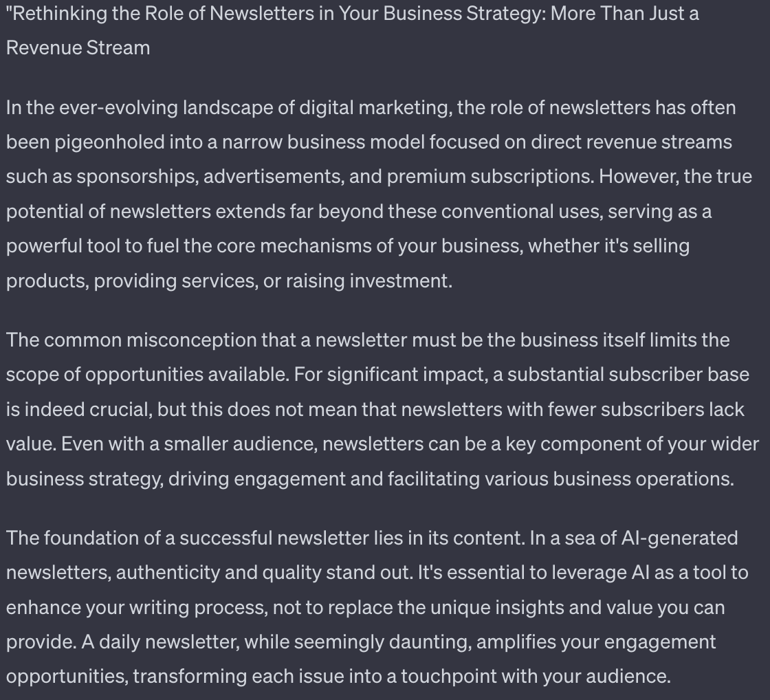 As always manually write and edit to your requirements. AI is for legwork, not brainwork.