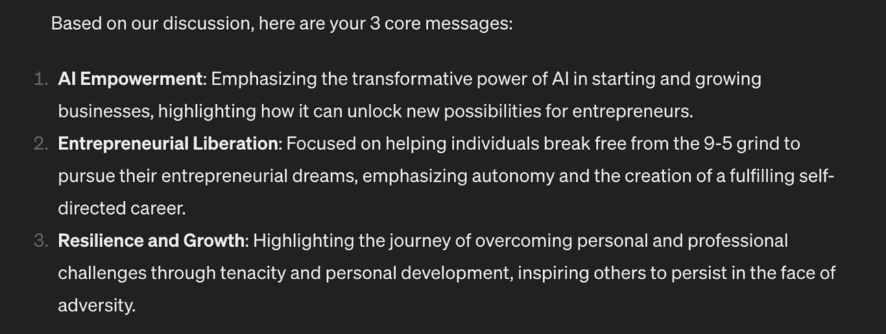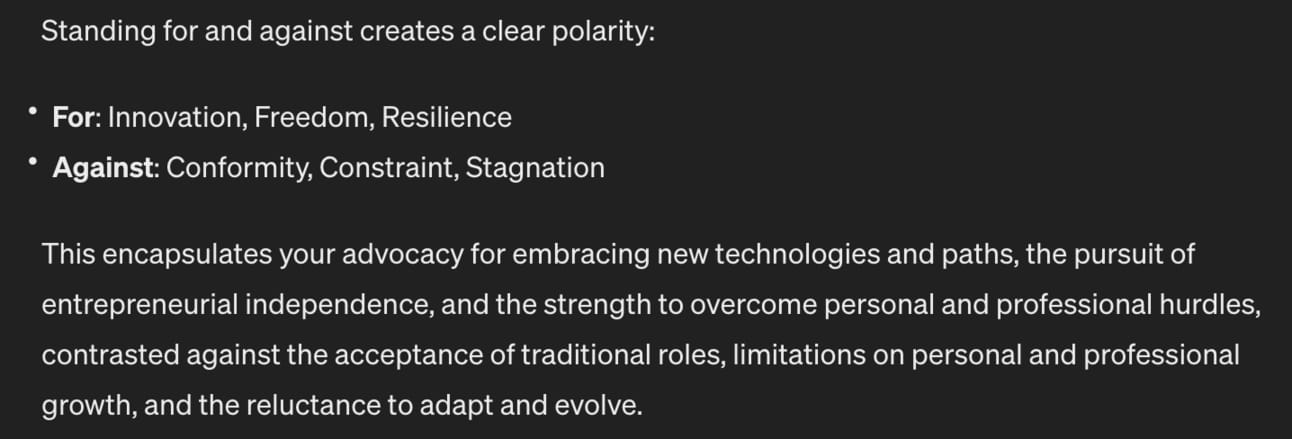 What do I stand for and against- create a polarity. Run through the coaching process with ChatGPT until the end. Then it’ll return your results, starting with your core messages: