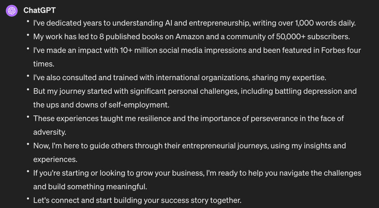 writing 1000+ words a day on my subject for deep domain expertise, published 8 amazon books, 50k+ subscribers, 10+ million social media impressions, featured in Forbes 4x, consult and train international organisations.Plug in your current personal and professional successes in the field connected to how you’ll be helping people.