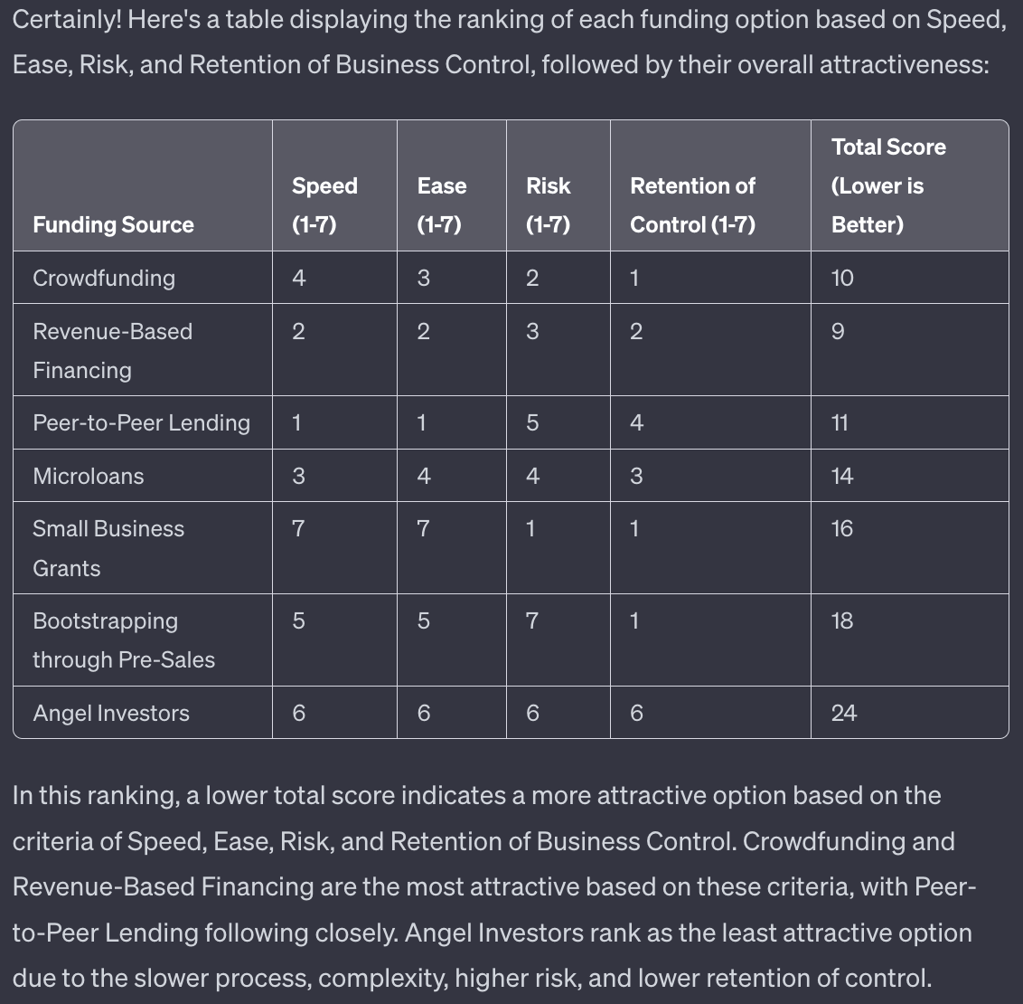 This prompt will guide you through a quick process and spit out some potetial funding sources like so: