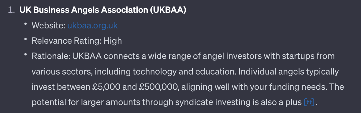 Also find the application process - my preference is for easy application via an online form or direct contact. This will ensure that ChatGPT gets an accurate gauge of i) the size and ii) type of investments covered by this funder.