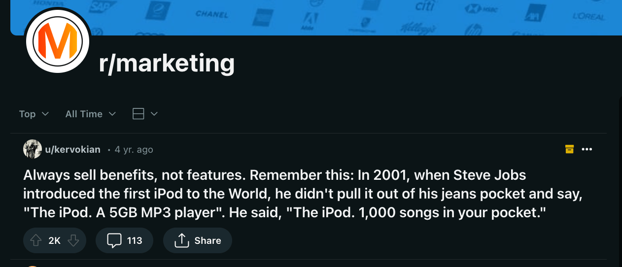 The post has 2k upvotes and 113 comments. The topic is definitely evergreen - sell benefits, not features. And it uses a timeless example - Jobs presenting the first iPod with its iconic zero-features tagline.