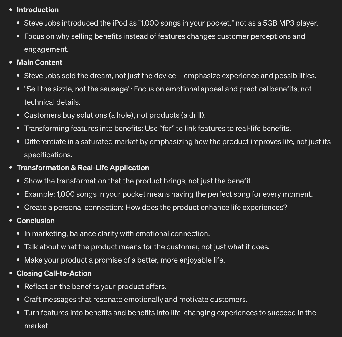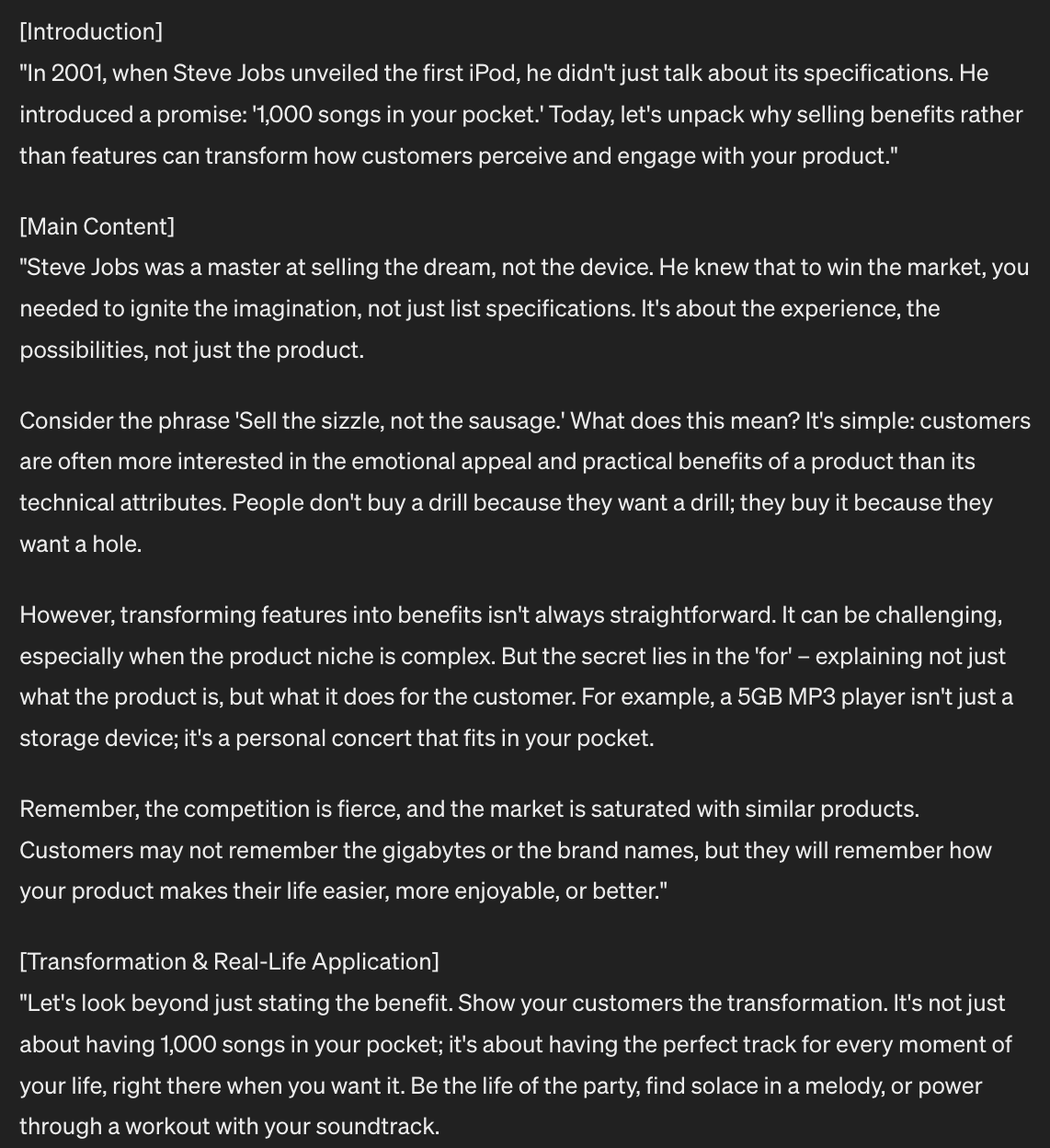 That whole “Sell the sizzle, not the sausage” section is inspired by comments by the way - giving us a nice set of metaphors to explain our point. That’s the power of dropping comments in too - it stops us getting a generic ChatGPT script.