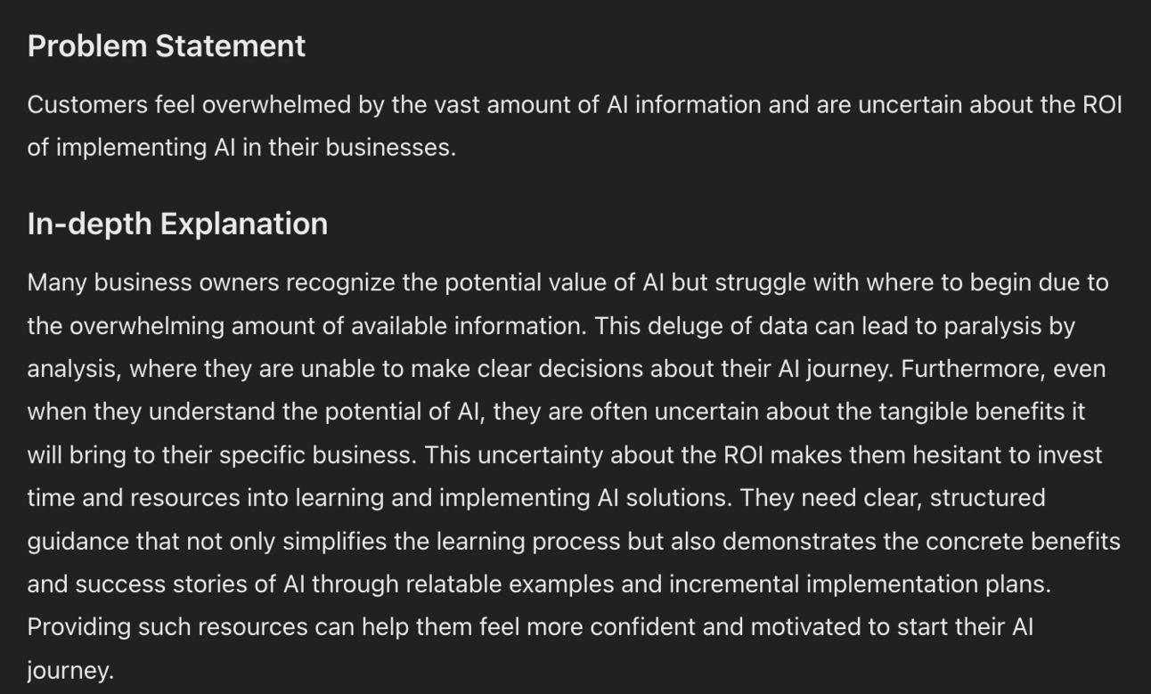 When we settle on a root problem relay it back to me in a short succinct problem statement followed by an in-depth explanation. I ran this process of the niche of “teaching AI to businesses” an received the following: