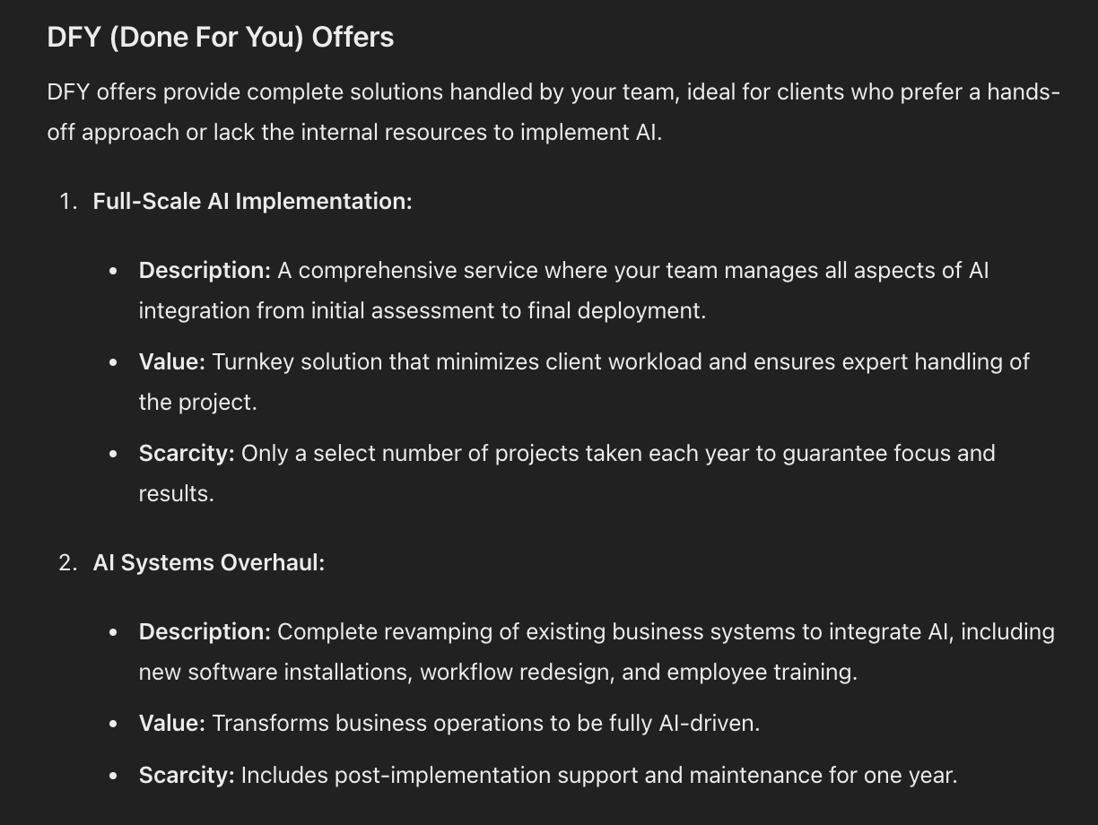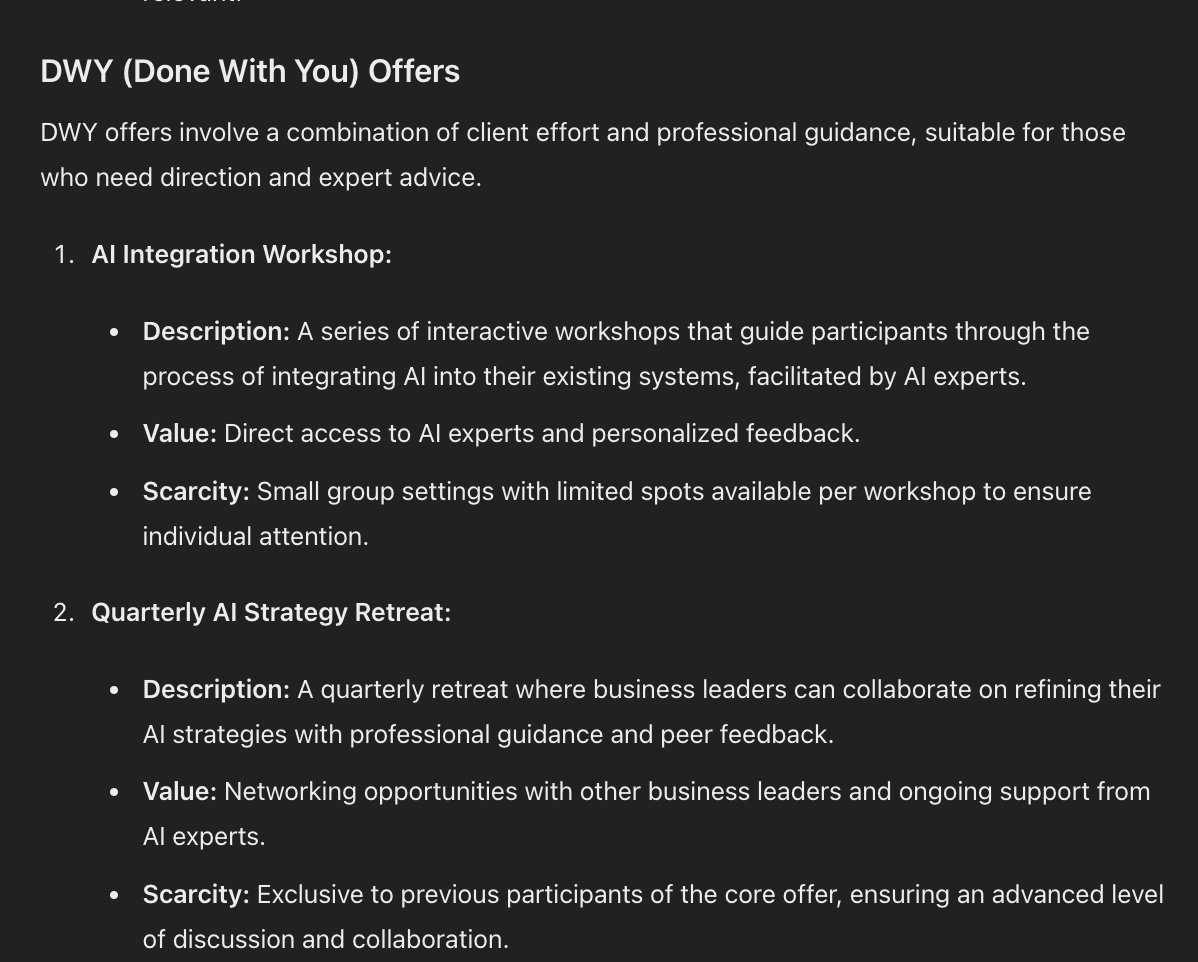 For example I use the niche of helping business leaders to integrate AI, fed it some funnel details and got these DWY suggestions: