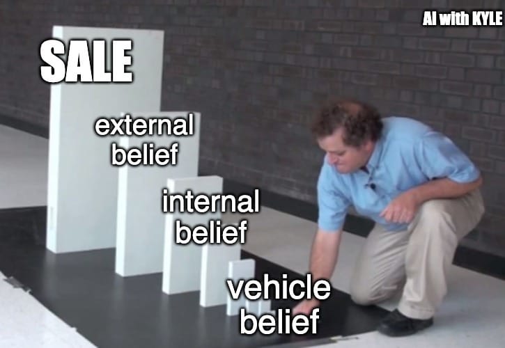 Why? Because I was only addressing one of the three beliefs. I was showing the product worked (vehicle belief) but ignoring whether they believed THEY could make it work (internal belief) and whether their situation would allow success (external belief).