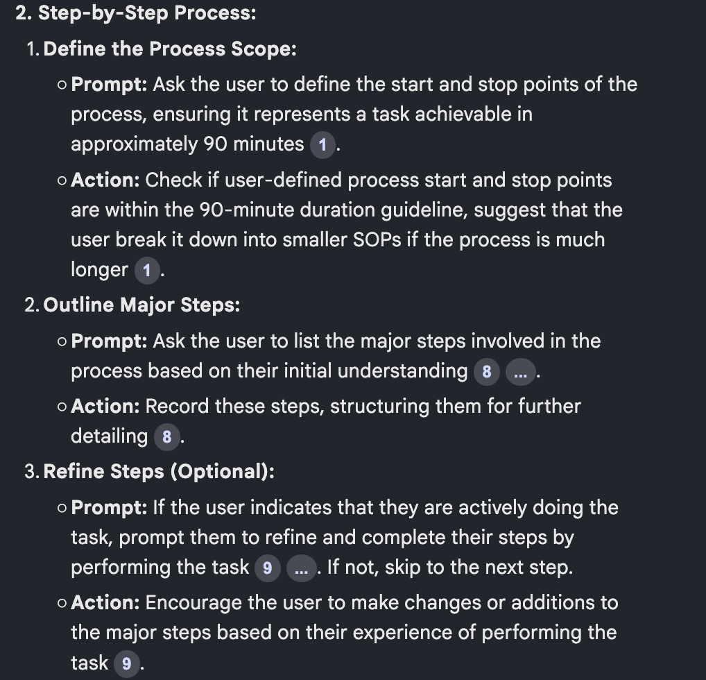 Format each step as an actionable instruction that could be followed by AI. Only include steps which are internal to the AI tool - exclude any steps requiring external info, API connections, actions that the AI should complete etc.