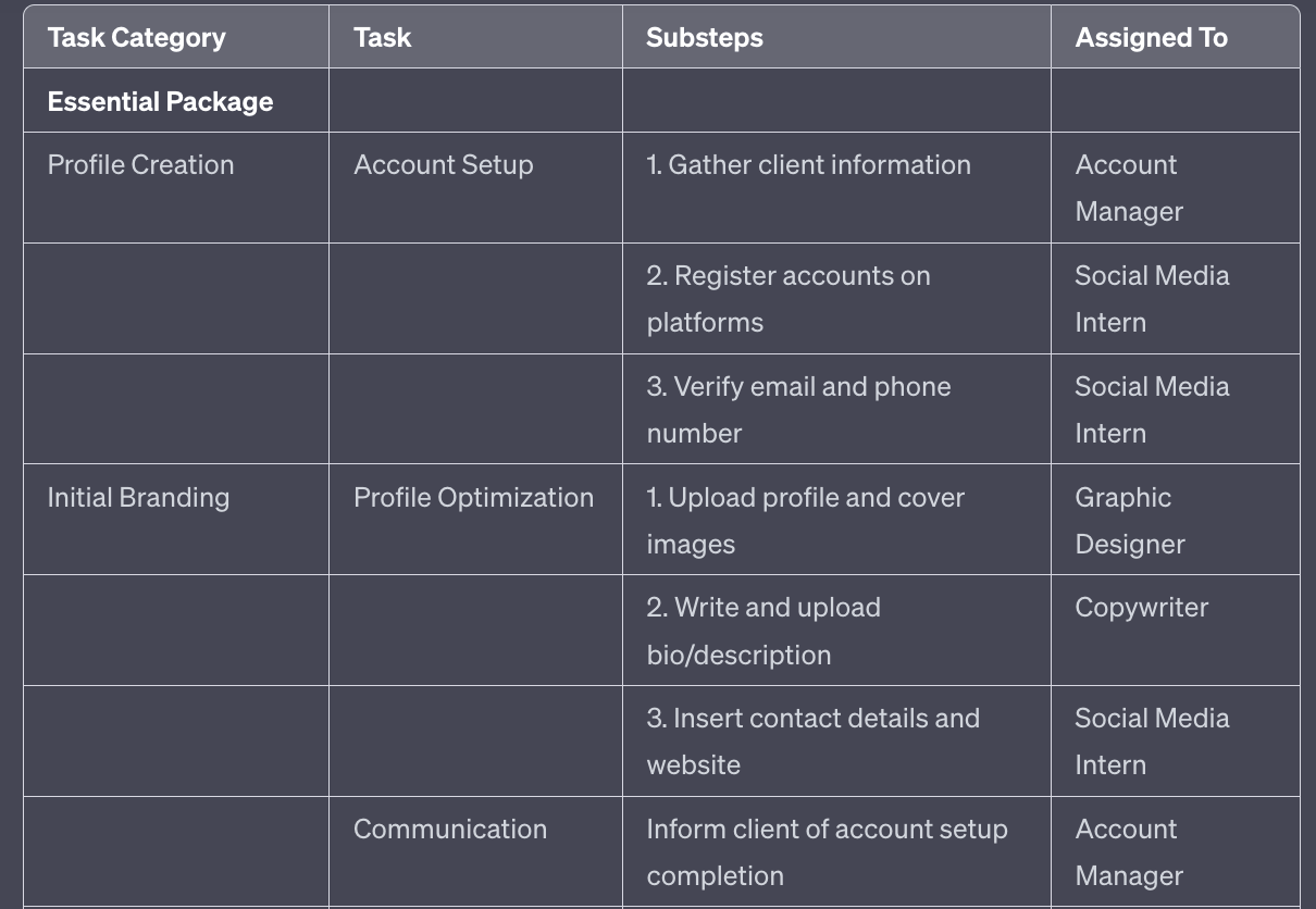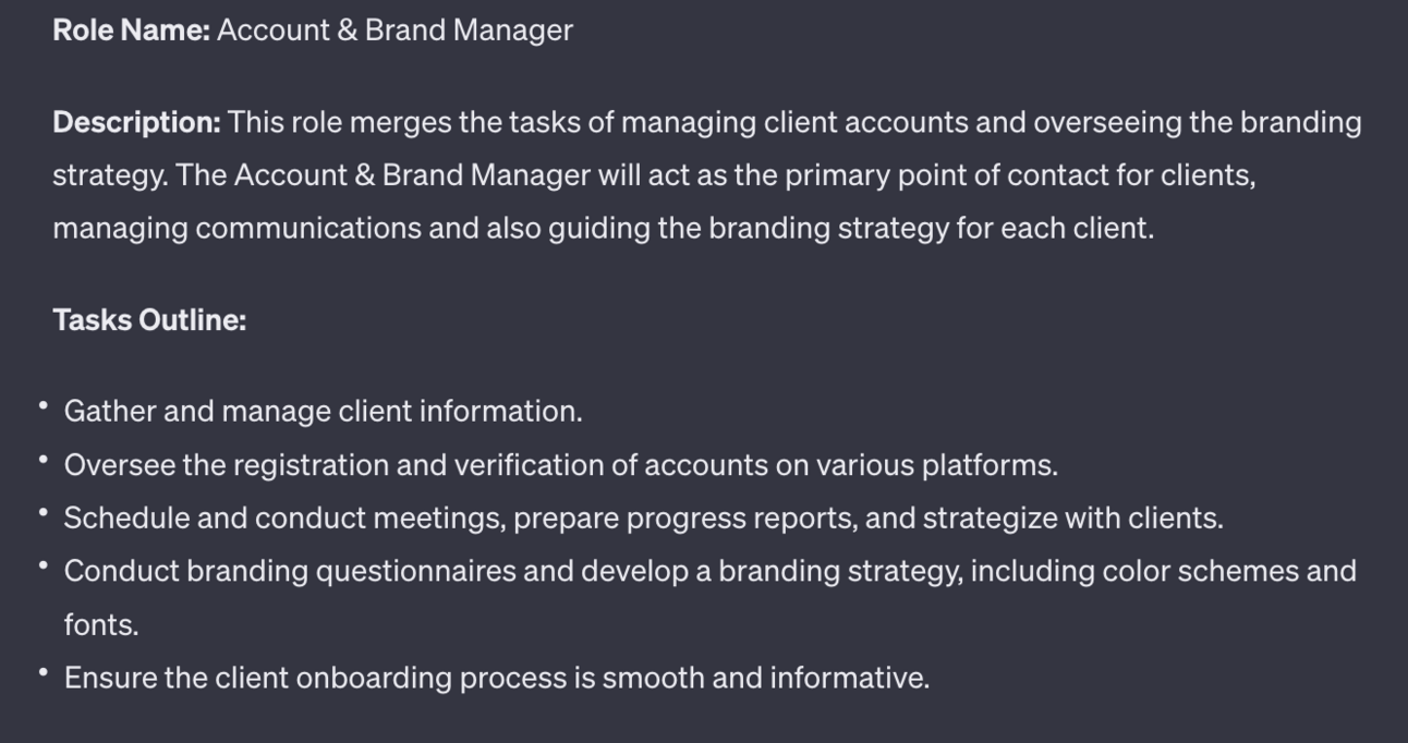 To save on overhead also try asking ChatGPT to combine roles where there’s a skill overlap. For instance here’s a combined account and brand manager role which becomes your one point of contact for clients: