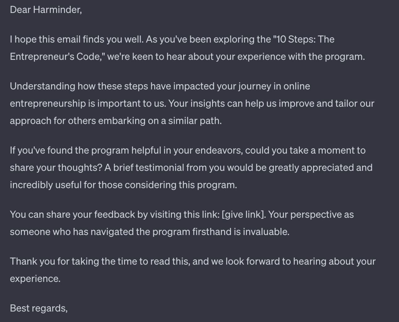 Here’s a prompt to write a personal request that you can email them. This will be the heaviest hitting and most likely to lead to a testimonial.