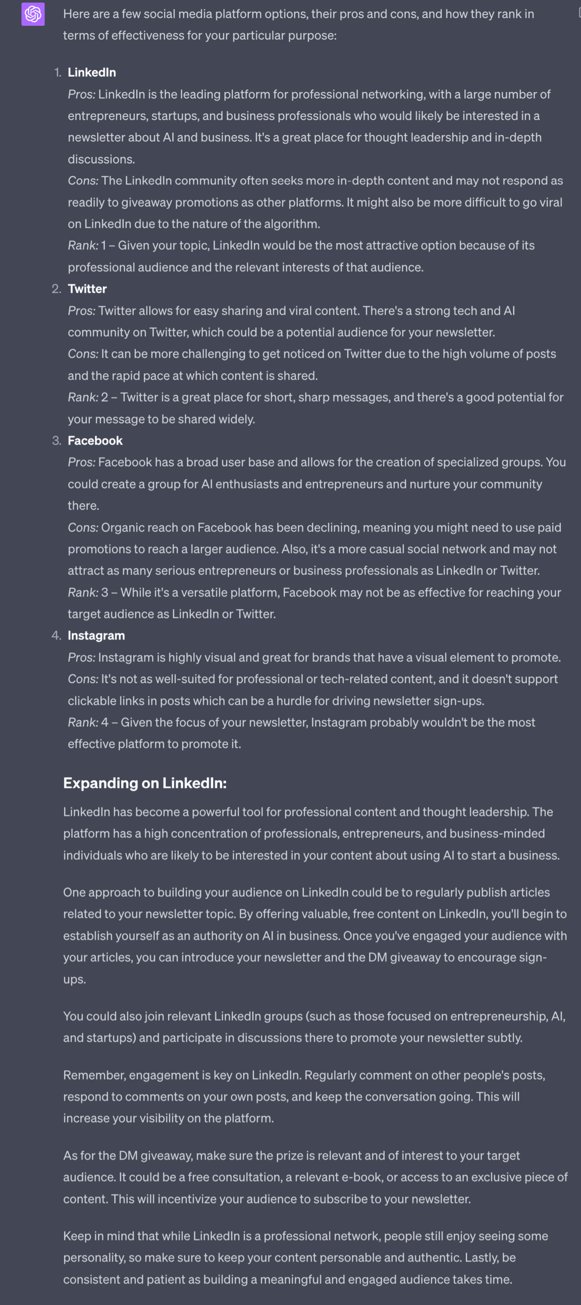 I actually use Twitter as primary and LinkedIn as secondary but ChatGPT’s analysis is spot on. The high frequency and effort required for Twitter is why ChatGPT chose to put it in #2 instead of #1 but for me personally that’s not a problem, hence it being top choice.