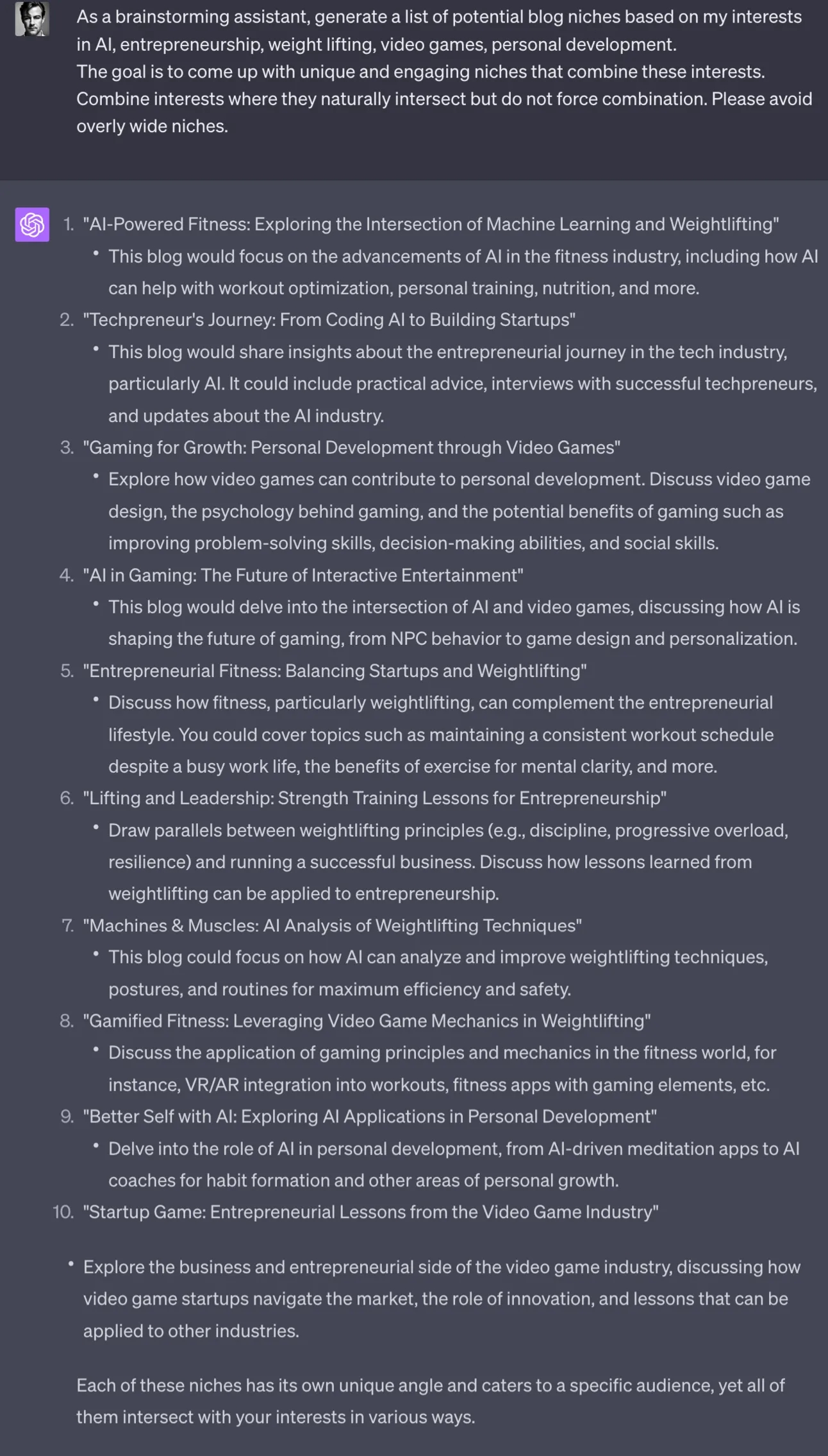 The goal is to come up with unique and engaging niches that combine these interests. Combine interests where they naturally intersect but do not force combination. Please avoid overly wide niches.Plug in interests, your work area, skills, hobbies. Anything that is important to you.