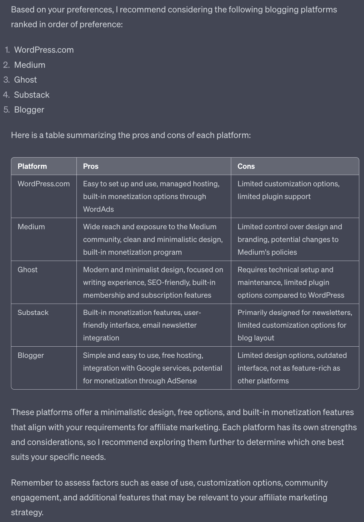 Return your ranking of results in order of highest to lowest preference based on my responses, with pros and cons of each platform, in a table.This prompt will run you through a similar set of questions to what I would personally ask you if we were sitting together.