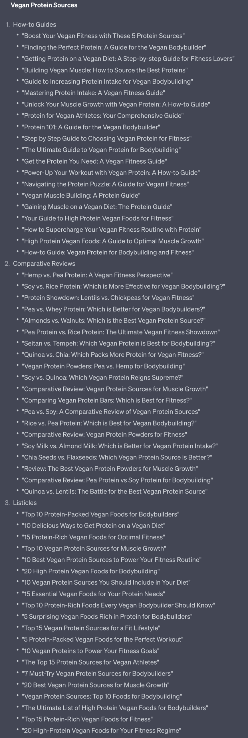 This is 20 blog titles per format type. And there are 3 format types per content pillar. For a total of 300 blog article titles.