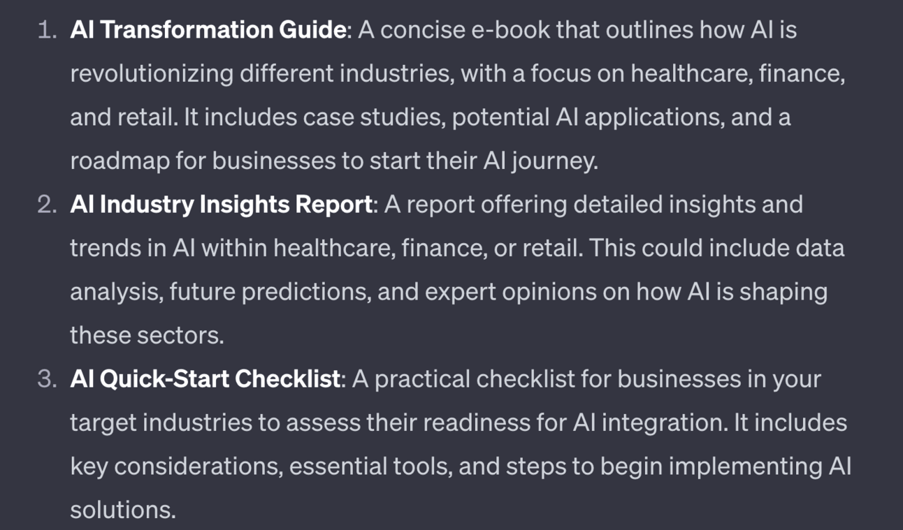 My business idea is [copy/paste business idea]This will generate a list of potential lead magnets for you: