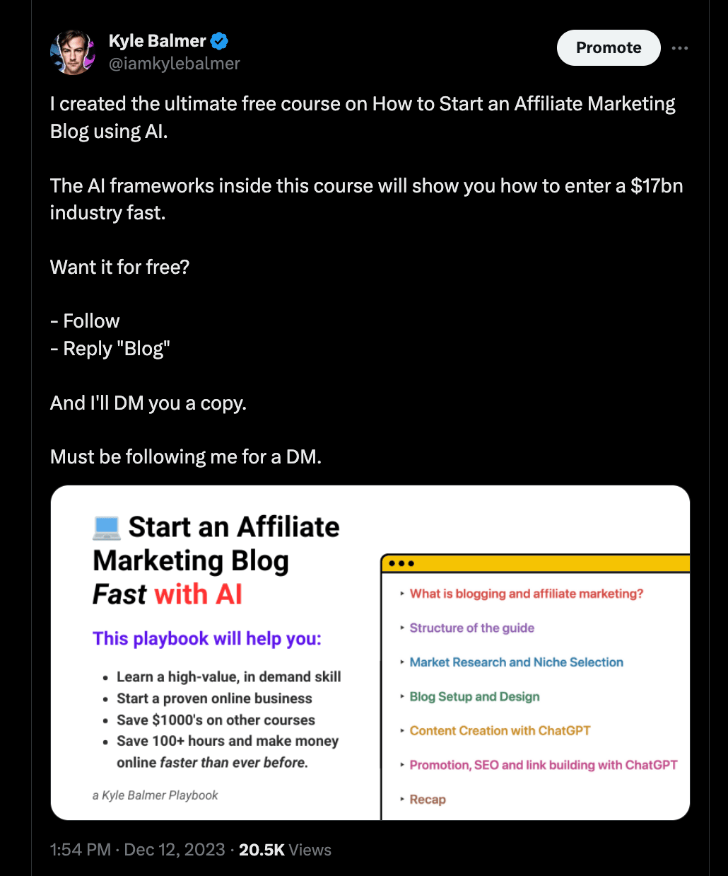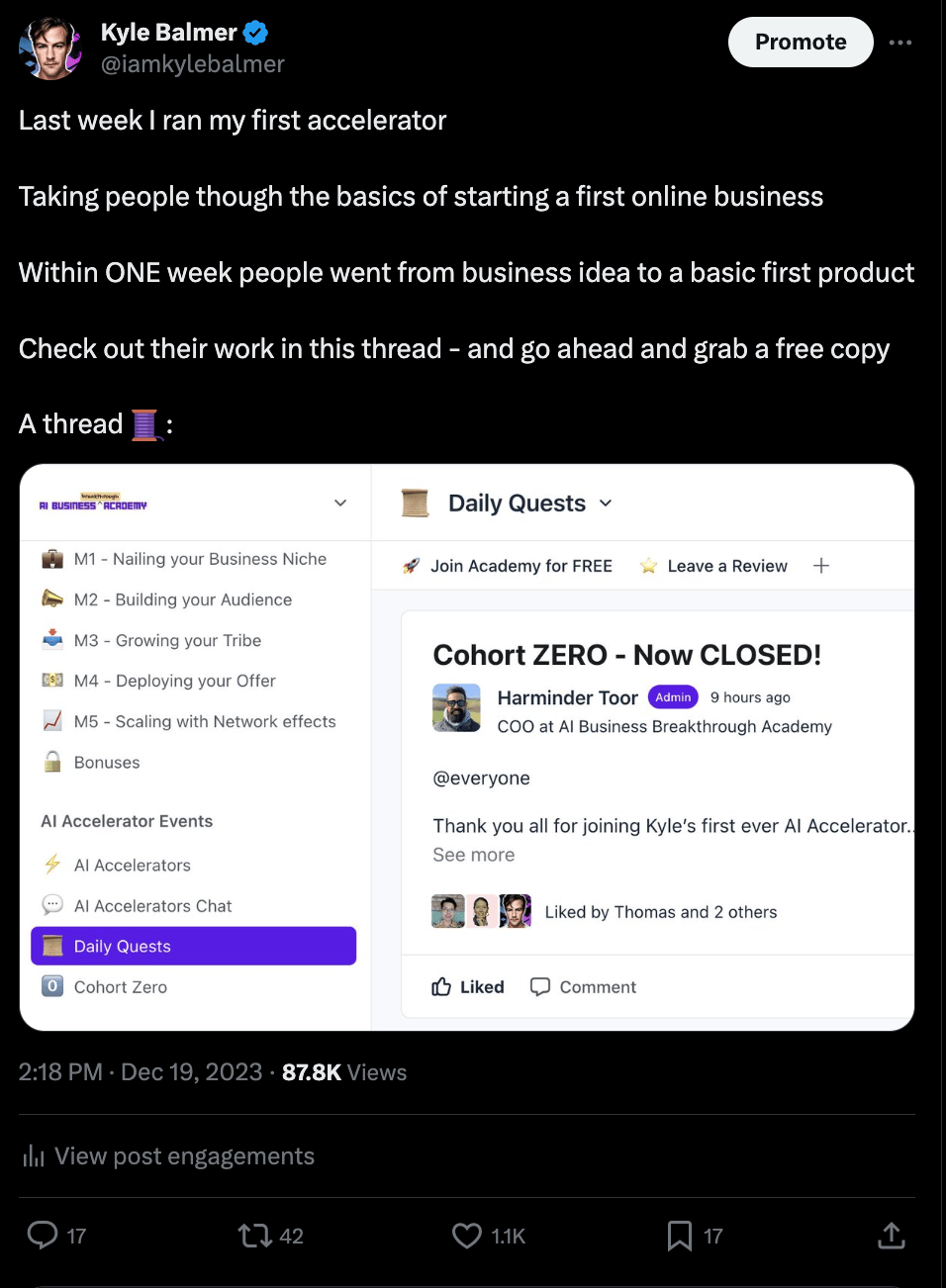 This tweet for example had 5 student’s lead magnets attached as a thread. 87,800 views on the thread and a decent chunk of traffic sent through to download their lead magnets.