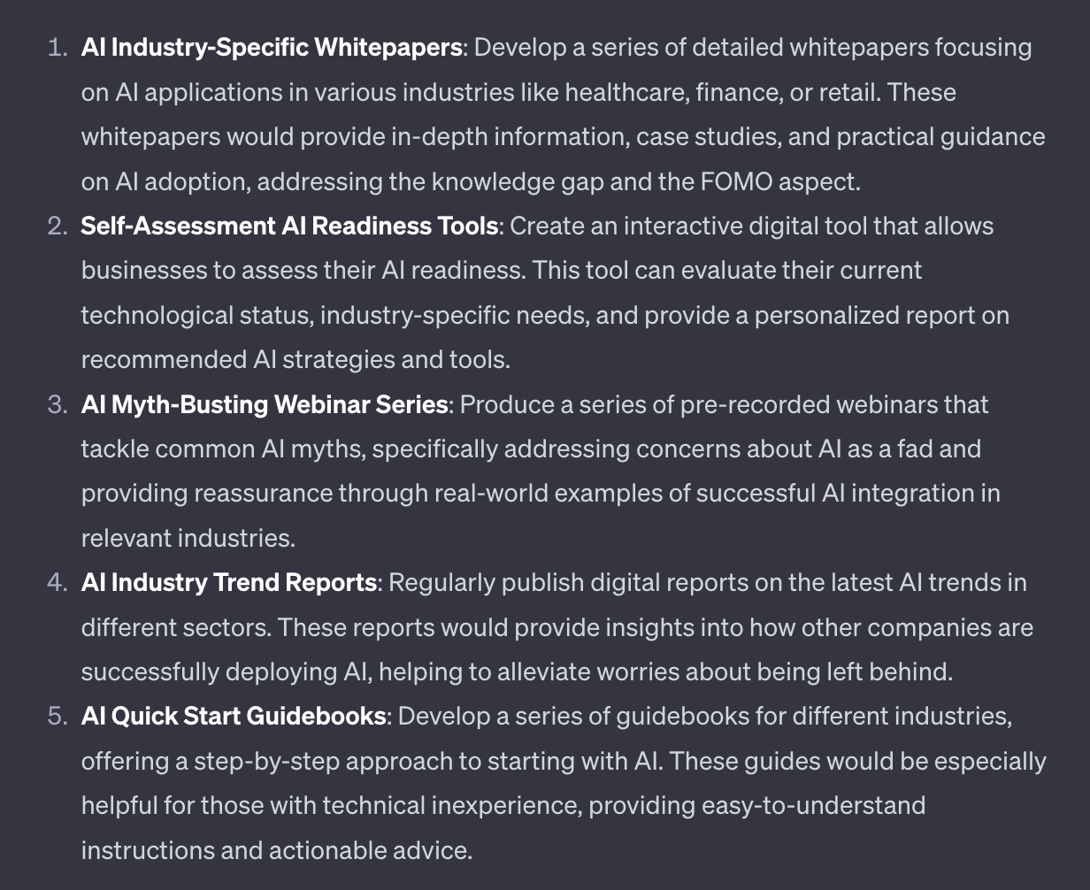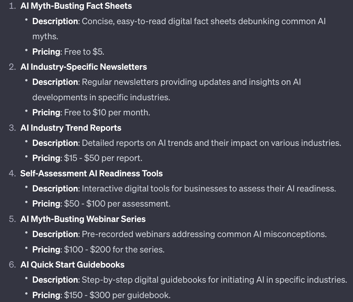 ChatGPT will also generate a handful of product ideas for us: