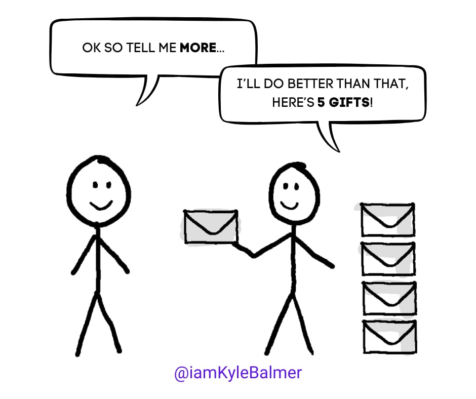 They've signed up via a lead magnet or similar piece of value. Now we give them some unexpected value in the email. Basically, a gift. Who doesn’t love gifts.