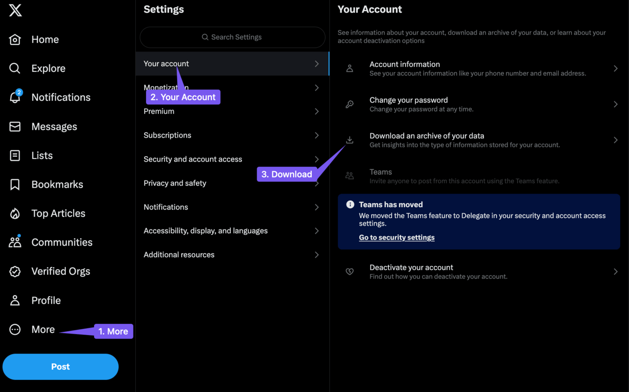 On the desktop version of X go to More > Settings > Your Account > Download an Archive of your Data
