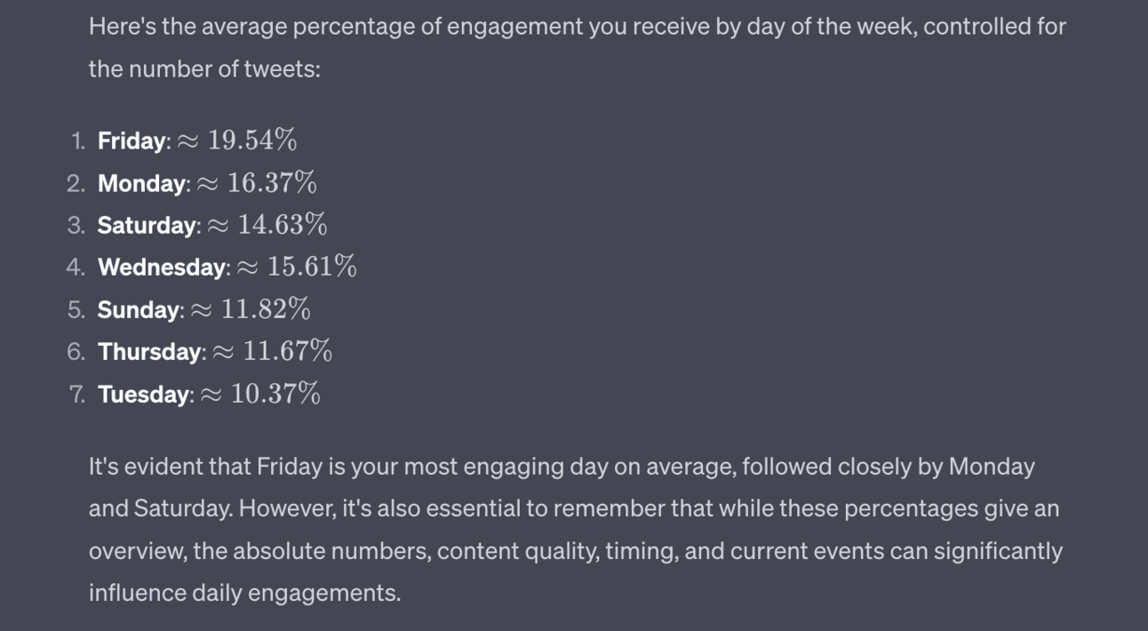 I can dig deeper by asking more questions. For instance if I ask for the “% of weekly engagement per day, controlled for the number of tweets by using average engagement per tweet” I get: