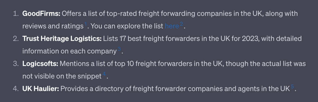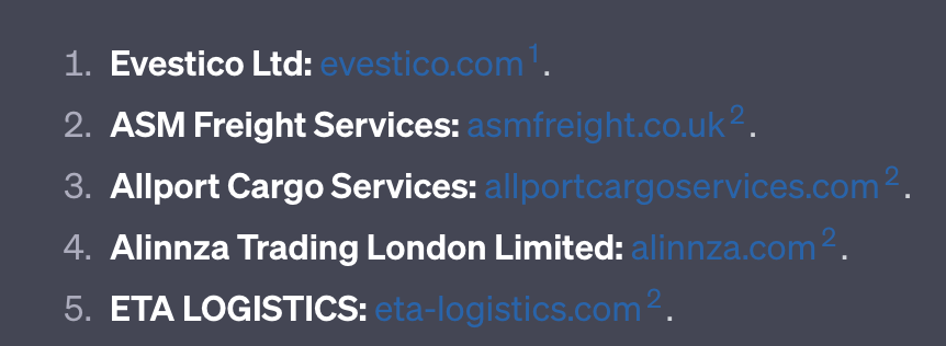 Research a list of 100 [niche type] in [location]I put in “Research a list of 100 freight forwarding companies in the UK” and received this: