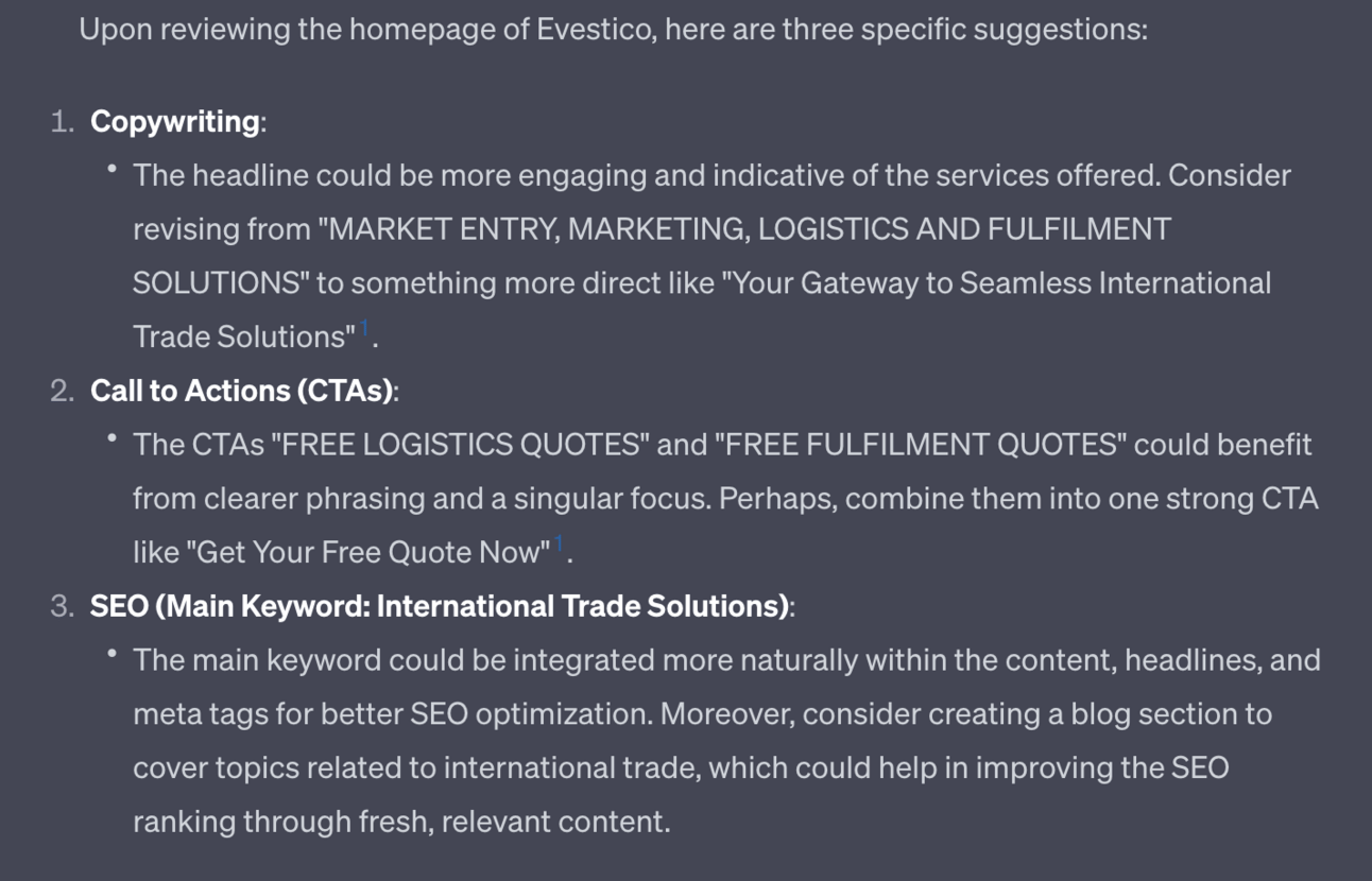 Focus on real issues not generic suggestionsChatGPT will run an analysis on the page and come up with suggestions for improvements.