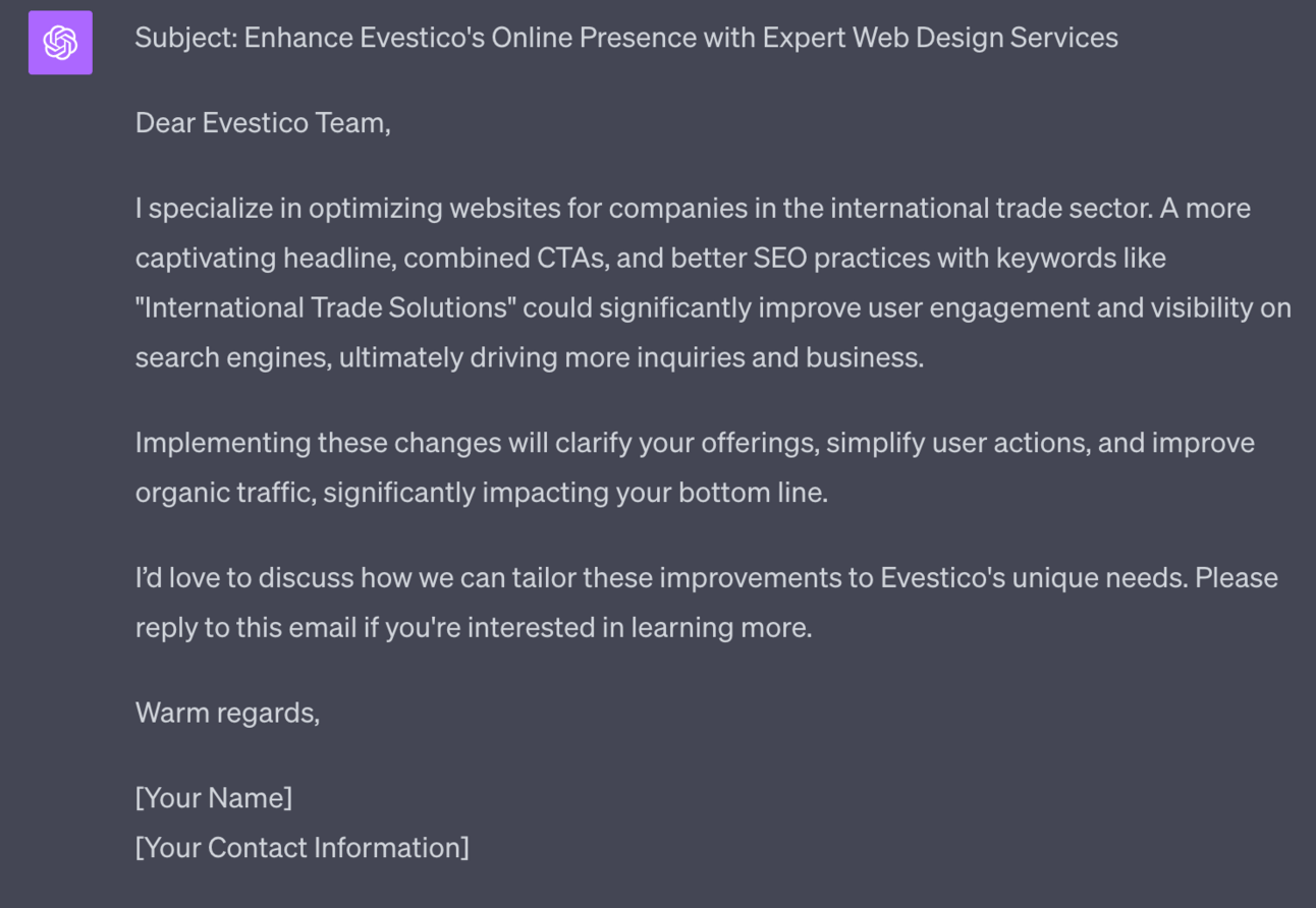 Based on these suggestions write a cold outreach email to the company offering web design services