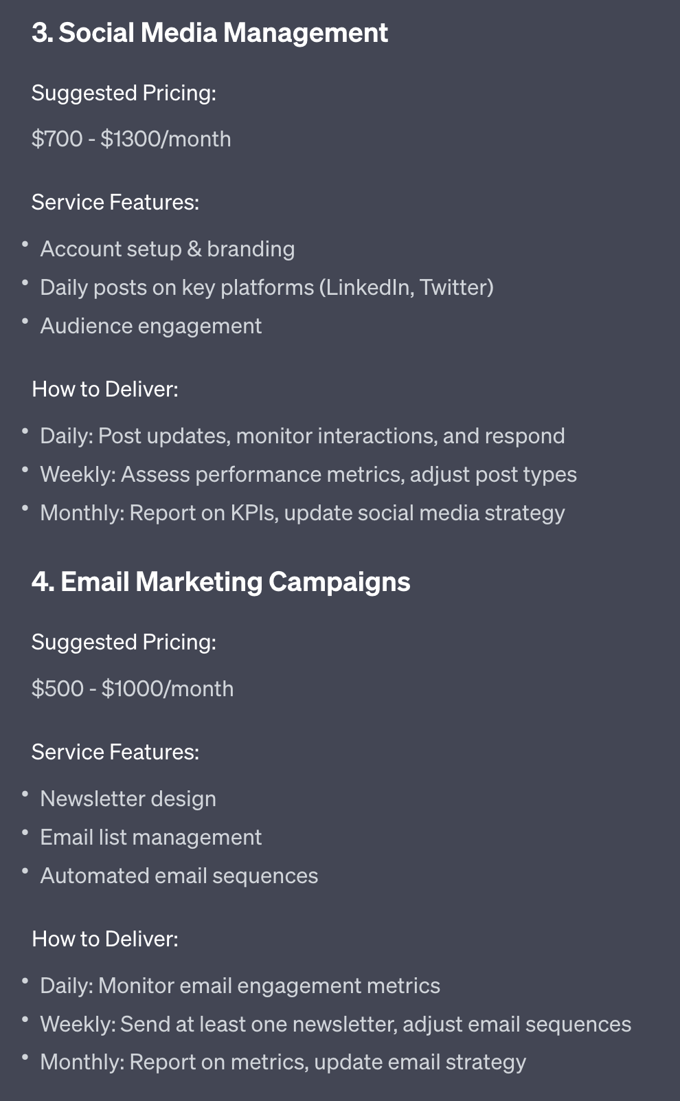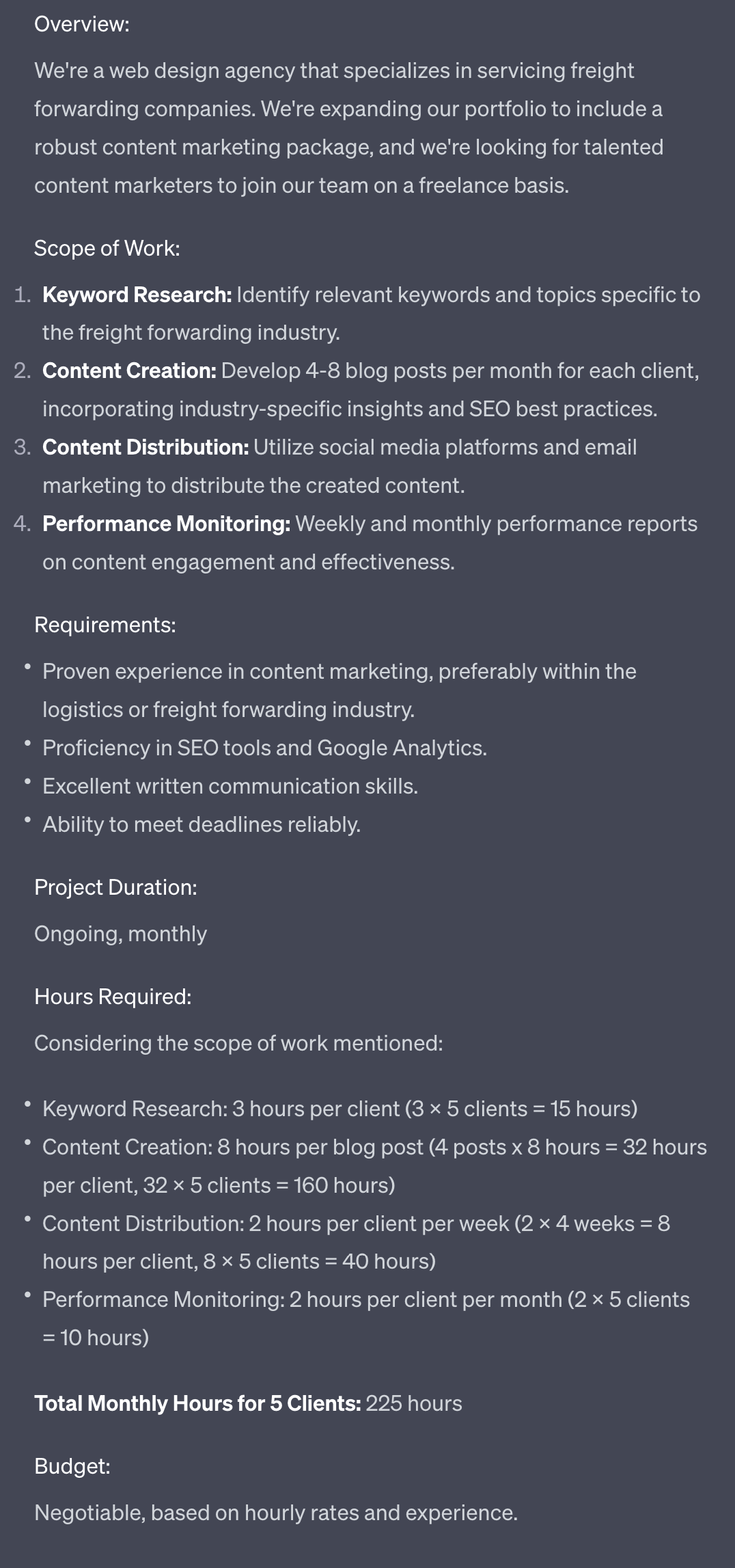 -brief list of how to deliver, daily, weekly, month work.This generated a list of 7 ideas specific to the “freight forwarding” industry I specified for the example. Here are two examples: