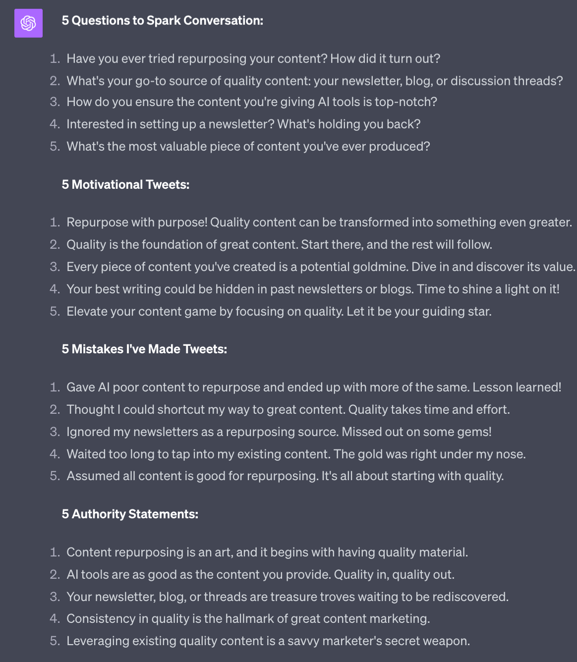 For example all my long form posts, threads and individual tweets can be about repurposing. It creates thematic consistency.