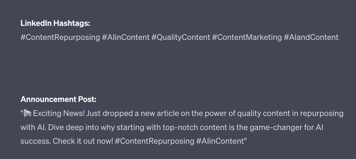 Alternatively, you may feel that you long form X isn’t quite right for LinkedIn. If that’s the case here’s a prompt to generate the LinkedIn article from scratch for you. Try both and compare results.
