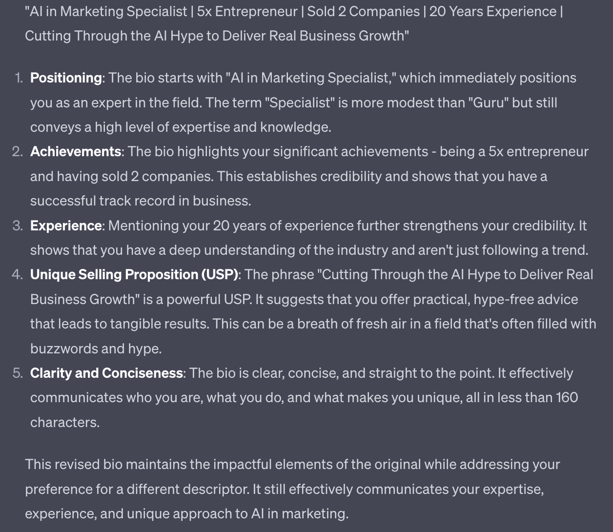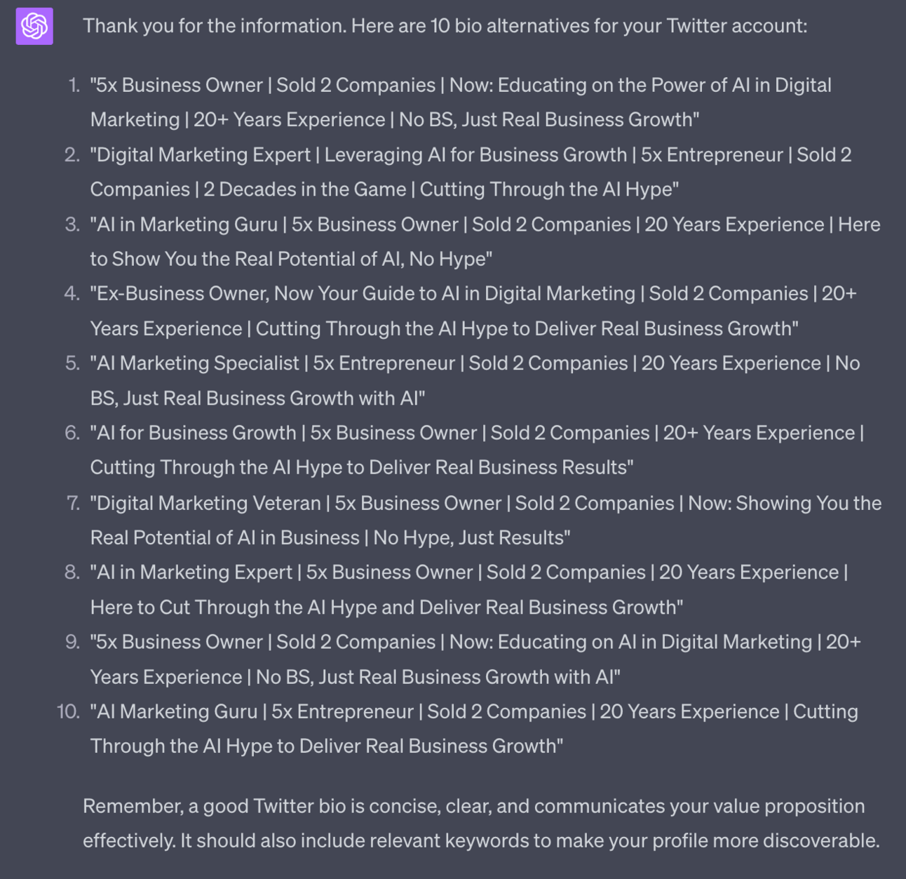 Then copy/paste in the bios of the other accounts. This will give ChatGPT a format to follow. This prompt will use this information to decide on the format of the bio and then it’ll ask extra questions to help fill in the gaps.