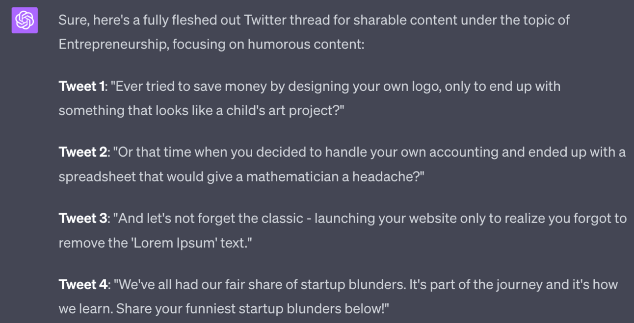 For example “Give me sharable content 1 for entrepreneurship as a fully fleshed out post/thread” would lead to the following output.