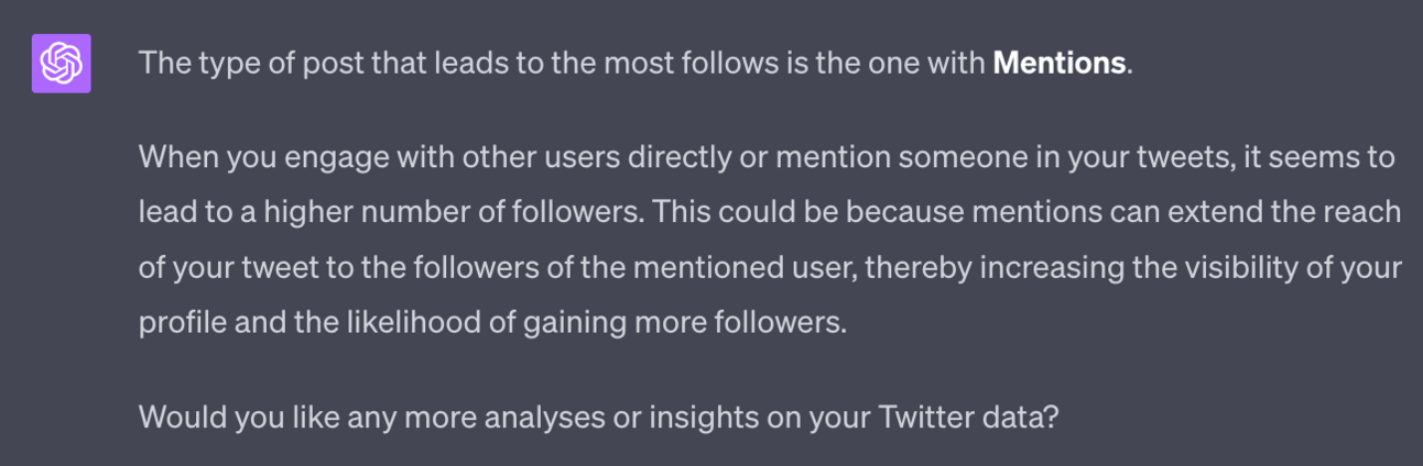 If you want a specific growth plan ask “Based on all of the data provided and only the data (do not draw from your past experience) suggest a follower growth plan.”