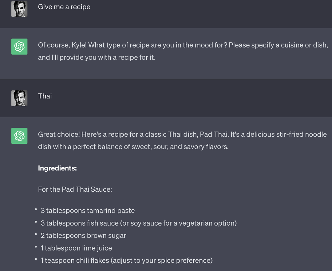 I reply Thai and this is enough for ChatGPT to make a judgement call and provide me with a recipe for pad thai. I’ve cut off the rest of the recipe and instructions for brevity.