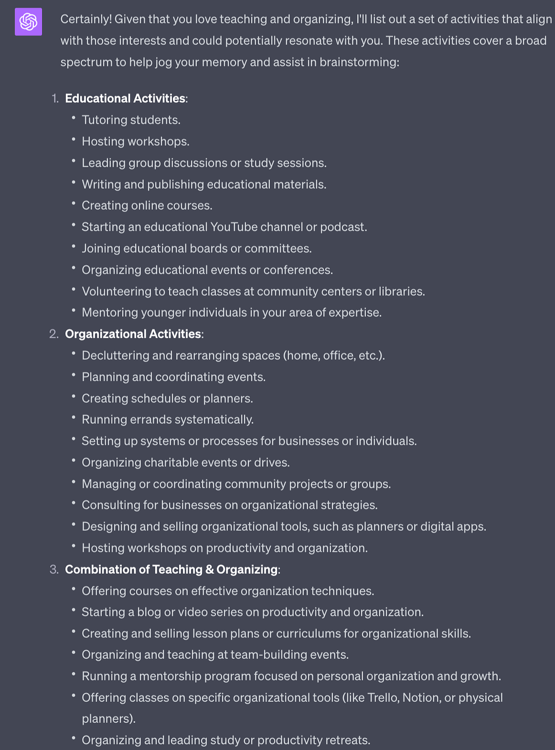 This prompt will take our original brainstorm and start giving us additional ideas. The purpose is purely to jog our memory.