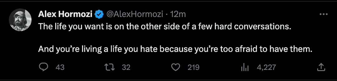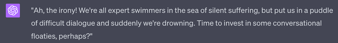 I trimmed it to “we might be expert swimmers in the sea of silent suffering, but chuck us in a puddle of difficult dialogue and suddenly we're drowning”