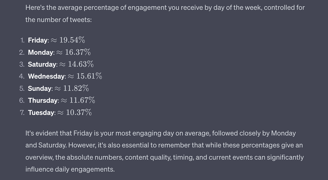 I can dig deeper by asking more questions. For instance if I ask for the “% of weekly engagement per day, controlled for the number of tweets by using average engagement per tweet” I get: