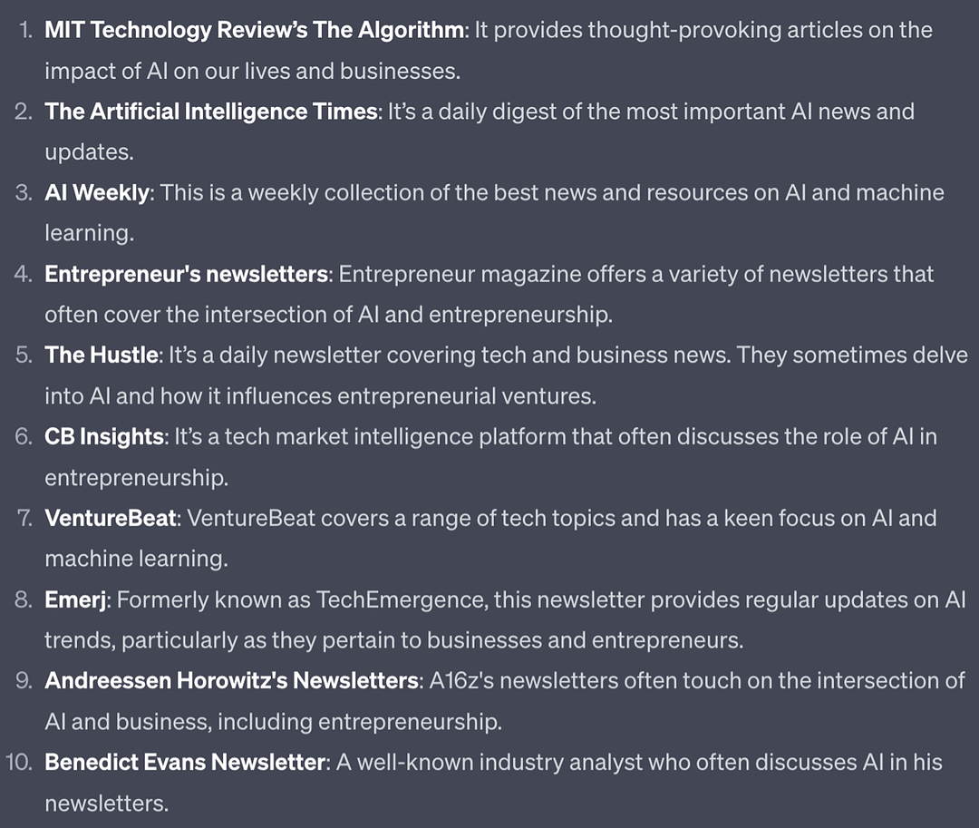 Using the prompt “Give me a list of newsletters that cover the topic of AI Driven Entrepreneurship”