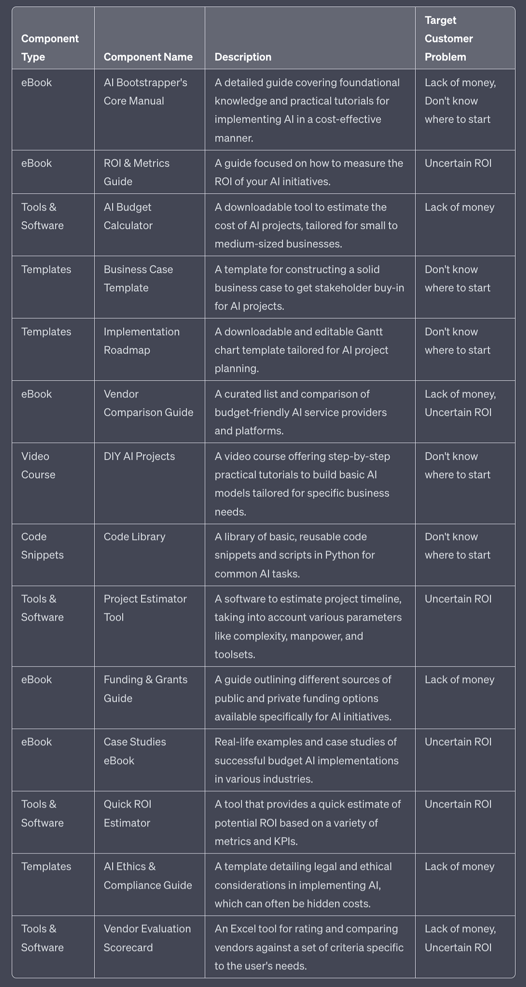 Create an exhaustive list of product components in a tabular format.