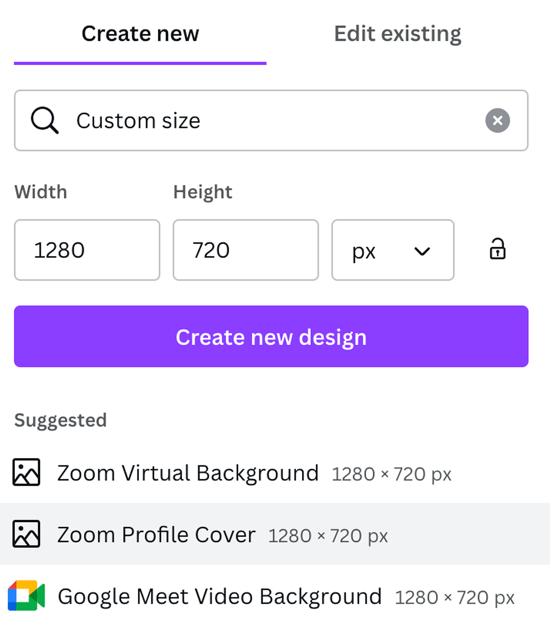 Head to Canva and create a new design. Choose custom size and enter 1280 width x 720 height:
