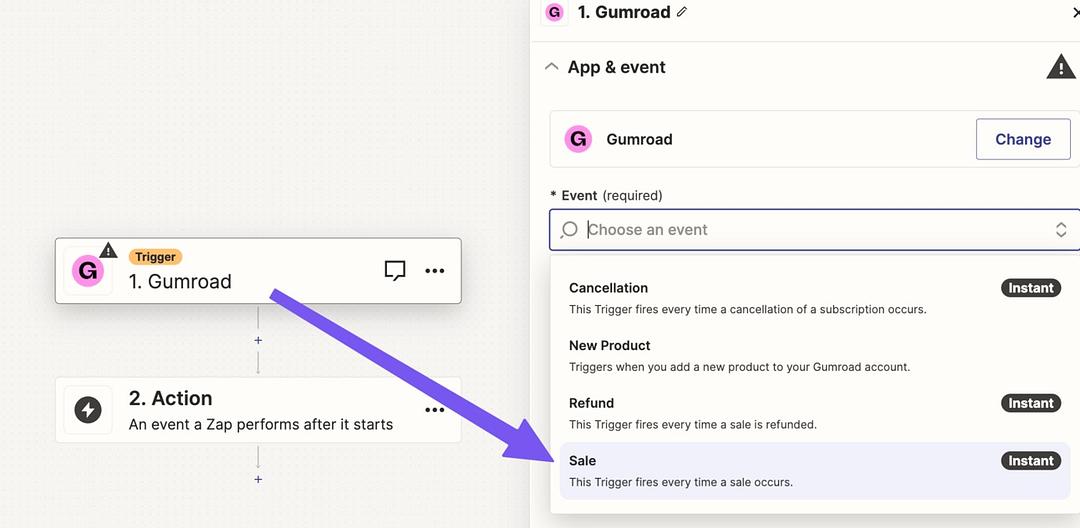 The Trigger is Gumroad > Sale.