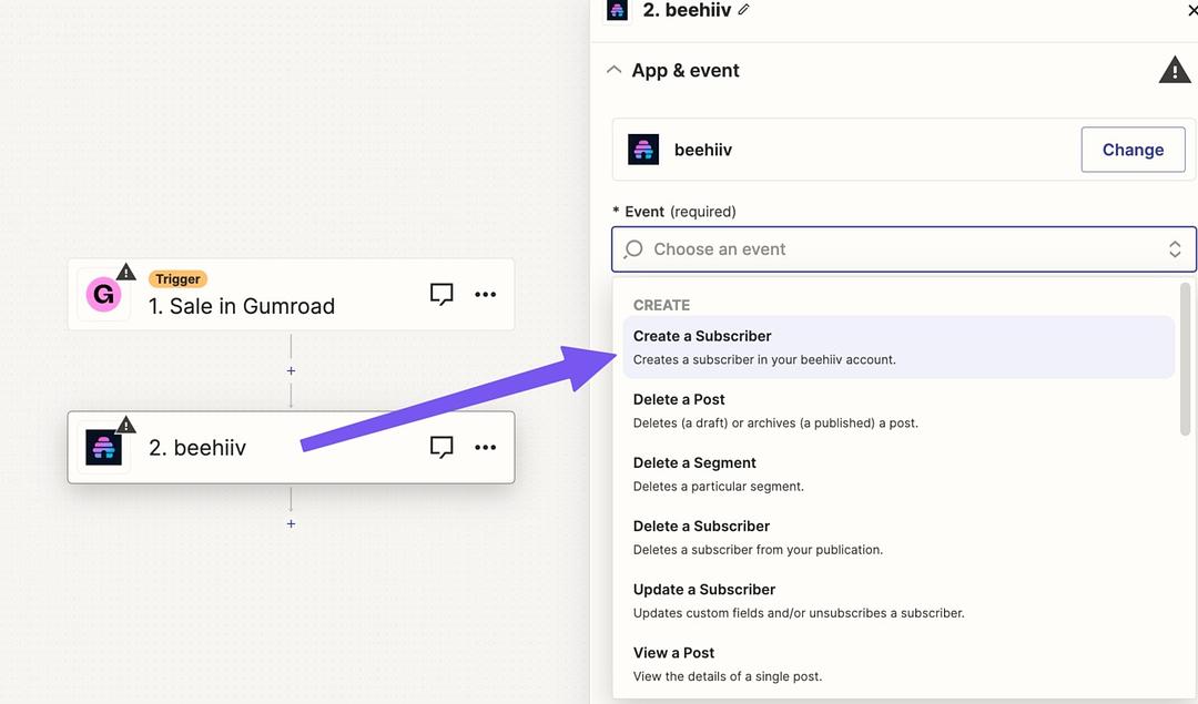 The Action is beehiiv > Create a Subscriber: