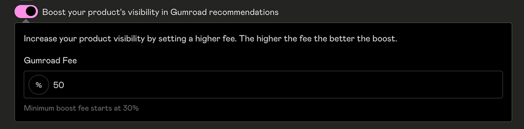 Notice you can also set the percentage you are willing to give Gumroad. This is up to you - the higher the fee the more they will boost.