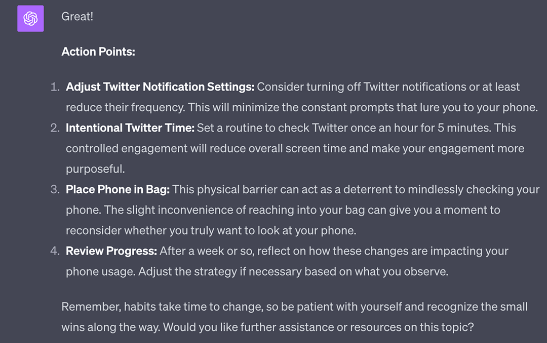 For example I can plug in “productivity coach” and “help me work out how to stop looking at my phone so much”