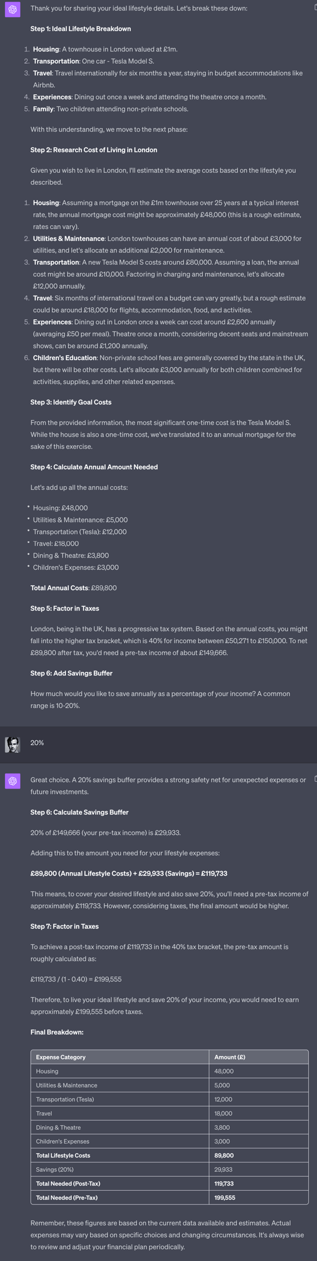 ChatGPT will take that basic information and run through the whole process of working out your required annual income for you.