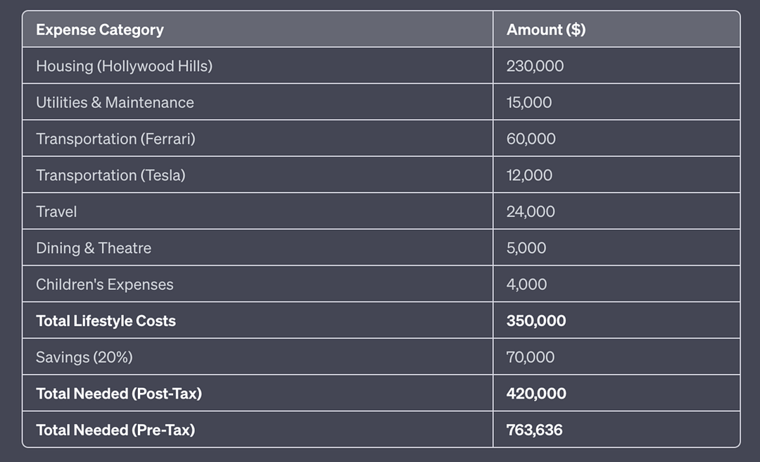 $763,636 per annum required to maintain my London - LA lifestyle.